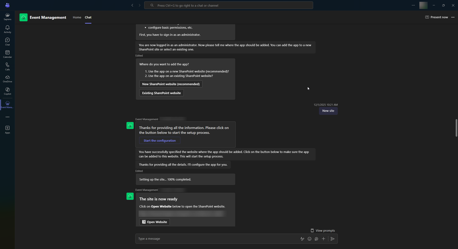 We strongly recommend using a dedicated SharePoint site for the Event Management app to simplify permissions, management, and long‑term maintenance. The bot guided installation allows you to select an existing site or create a new site for you. If you prefer to install the app to your SharePoint website manually, please prepare the website before you start with Option 2.